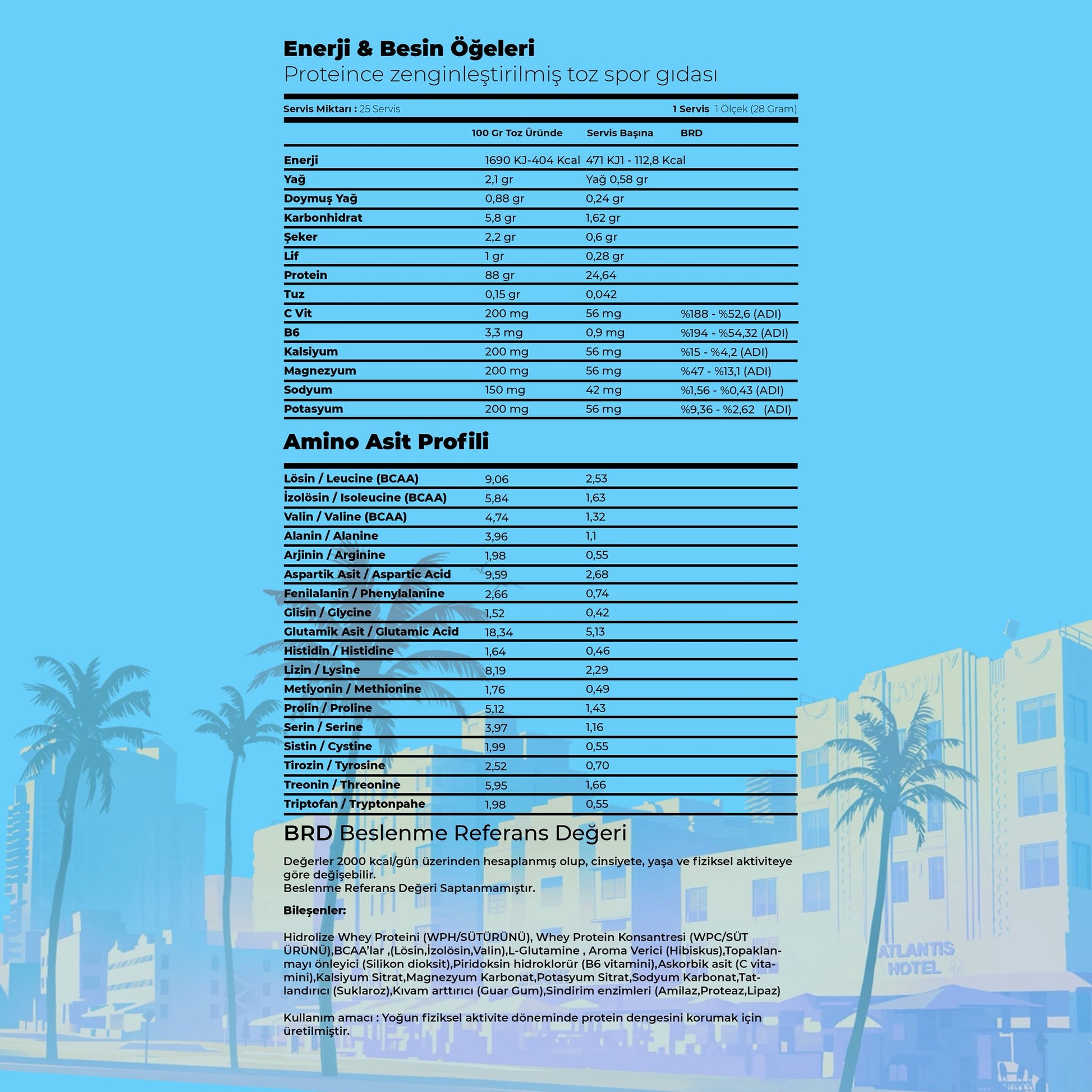 hidrasyonu korumaya, performans düşüşünü önlemeye yardımcı olur. Servis başına 8,8 gr amino asit + 300 mg magnezyum,300 mg potasyum,200 mg kalsiyum desteği