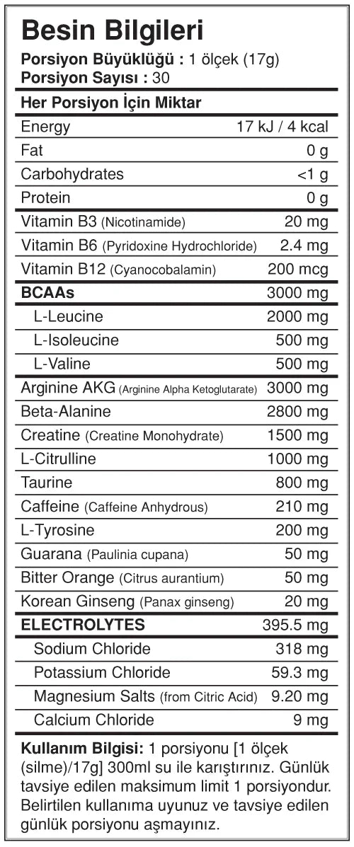 Antrenman öncesinde 1 ölçeği 300-500 ml suya karıştırarak tüketebilirsiniz.
